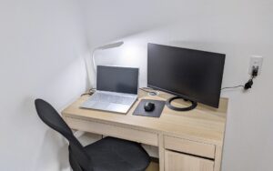 増設したコンセントから書斎デスク上のパソコンへ直接電源を供給できるようになり、延長コードは不要となりました。足元の配線も解消され、安全性と作業効率の向上につながっています。
