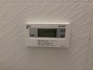 本体は戸建家屋の裏口付近に設置し、合わせて浴室内のリモコンもMITSUBISHI製の新品へ交換しています。